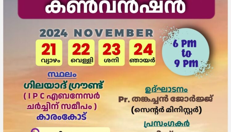 കൊട്ടാരക്കര: ഇന്ത്യ പെന്തക്കോസ്ത് ദൈവസഭ ചാത്തന്നൂർ സെന്റർ സിൽവർ ജൂബിലി കൺവൻഷൻ 2024 നവംബർ 21മുതൽ 24 വരെ കാരംകോട് സ്പിന്നിംഗ് മില്ലിനു സമീപം ഗിലയാദ് ഗ്രൗണ്ടിൽ നടക്കും. സെന്റർ ശുശ്രൂഷകൻ പാസ്റ്റർ തങ്കച്ചൻ ജോർജ് ഉദ്ഘാടനം ചെയ്യും. പാസ്റ്ററന്മാരായ അനീഷ് കൊല്ലം, ലാസർ വി. മാത്യു, ബി. മോനച്ചൻ , സാം ജോർജ് , ഫിന്നി പി. മാത്യു എന്നിവർ പ്രസംഗിക്കും. ഗിലയാദ് ക്വയർ പുനലൂർ സംഗീത ശുശ്രൂഷയ്ക്ക് നേതൃത്വം നല്കും. കൺവൻഷനോടനുബന്ധിച്ച് സണ്ടേസ്കൂൾ ,പി.വൈ.പി.എ , വുമൺ ഫെലോഷിപ്പ് വാർഷികം, സംയുക്ത സഭയോഗം എന്നിവ നടക്കുമെന്ന് സെന്റർ സെക്രട്ടറി പാസ്റ്റർ സണ്ണി മോൻ ജോർജ് പബ്ലിസിറ്റി കൺവീനർ പാസ്റ്റർ അനിയൻകുഞ്ഞ് എന്നിവർ അറിയിച്ചു.