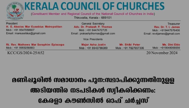 മണിപ്പൂരില് സമാധാനം പുന:സ്ഥാപിക്കുന്നതിനുള്ള അടിയന്തിര നടപടികള് സ്വീകരിക്കണം: കേരളാ കൗണ്സില് ഓഫ് ചര്ച്ചസ്
