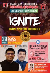ക്രൈസ്തവ എഴുത്തുപുര യൂ.ഏ.ഇ ചാപ്റ്റർ അപ്പർ റൂം ഓൺലൈൻ ആത്മീയ സംഗമം ഇഗ്നൈറ്റ് നവംബർ 29 ന്