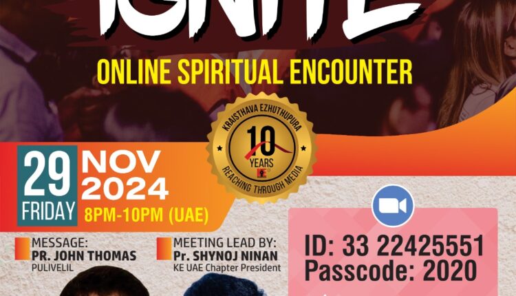 ദുബായ് : ക്രൈസ്തവ എഴുത്തുപുര യൂ.ഏ.ഇ ചാപ്റ്റർ അപ്പർ റൂം ന്റെ നേതൃത്വത്തിൽ നടക്കുന്ന ഓൺലൈൻ ആത്മീയ സംഗമം ഇഗ്നൈറ്റ് നവംബർ 29 ന് വൈകിട്ട് 8 മണി മുതൽ ഓൺലൈൻ പ്ലാറ്റ്ഫോം സൂമിൽ നടക്കും. ക്രൈസ്തവ എഴുത്തുപുര യൂ.ഏ.ഇ ചാപ്റ്റർ പ്രസിഡന്റ് പാസ്റ്റർ ഷൈനോജ് നൈനാൻ അദ്ധ്യക്ഷത വഹിക്കും . പാസ്റ്റർ ജോൺ തോമസ് പുളിവേലി മുഖ്യ സന്ദേശം നൽകും.