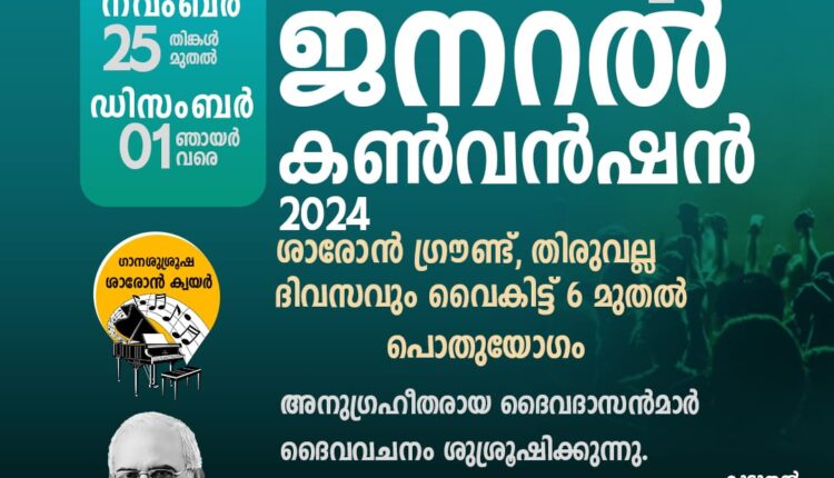 തിരുവല്ല: ശാരോൻ ഫെലോഷിപ്പ് ചർച്ചിൻ്റെ ഈ വർഷത്തെ ജനറൽ കൺവൻഷൻ ഇന്ന് മുതൽ ഡിസംബർ 1 ഞായർ വരെ തിരുവല്ല ശാരോൻ കൺവൻഷൻ ഗ്രൗണ്ടിൽ വച്ച് നടക്കും. ” പുതുക്കം പ്രാപിക്കുക, യഥാസ്ഥാനപ്പെടുക”