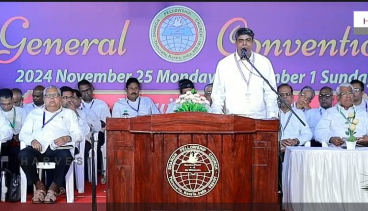 ശാരോൻ ഫെലോഷിപ്പ് ചർച്ച് ജനറൽ കൺവൻഷന്റെ മൂന്നാം ദിവസം സംസാരിക്കുകയായിരുന്നു അദ്ദേഹം. പാസ്റ്റർ അലക്സാണ്ടർ ഫിലിപ്പ് അധ്യക്ഷത വഹിച്ചു. പാസ്റ്റർ ബി വർഗീസ് മുഖ്യ സന്ദേശം നൽകി. ബ്രദർ കെ ഇ ജോർജ്കുട്ടി,പാസ്റ്റർ റോയ് വർഗീസ്, പാസ്റ്റർ പി എ ചാക്കോച്ചൻ,പാസ്റ്റർ റോയ് വി സാമൂവേൽ തുടങ്ങിയവർ പ്രാർത്ഥനയ്ക്ക് നേതൃത്വം നൽകി. നാളെ രാവിലെ 9.30ന് മിഷൻ കോൺഫറൻസും ഉച്ചയ്ക്ക് 2. 30ന് മിഷൻ ചലഞ്ചും വൈകിട്ട് 6ന് പൊതുയോഗവും നടക്കും. ഡിസംബർ 1 ഞായറാഴ്ച രാവിലെ 8 മുതൽ നടക്കുന്ന സംയുക്ത ആരാധന, കർത്തൃമേശ എന്നിവയ്ക്കു ശേഷം സമാപന സമ്മേളനത്തോടെ ഉച്ചയ്ക്ക് 1 മണിക്ക് കൺവൻഷൻ സമാപിക്കും. ശാരോൻ ക്വയർ ഗാനശുശ്രൂഷകൾക്ക് നേതൃത്വം നൽകി.