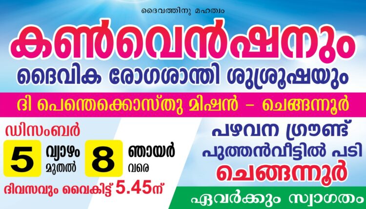 ചെങ്ങന്നൂർ: ദി പെന്തെക്കോസ്ത് മിഷൻ തിരുവല്ല സെന്ററിന്റെ പ്രാദേശിക സഭയായ ചെങ്ങന്നൂർ റ്റി.പി.എം വാർഷിക കൺവൻഷനും ദൈവീക രോഗശാന്തി ശുശ്രൂഷയും ഡിസംബർ 5 മുതൽ 8 വരെ പുത്തൻവീട്ടിൽപടി പഴവന ഗ്രൗണ്ടിൽ നടക്കും.