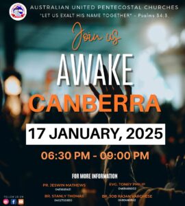 Australia: Australian United Pentecostal Churches (AUPC) conducting an inspiring musical evening “Awake Canberra” on Wednesday, 17th January 2025, from 6:30 PM to 9:00 PM.