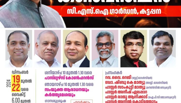 കട്ടപ്പന: ചർച്ച്ഓഫ് ഗോഡ് ഇൻ ഇന്ത്യാ ഹൈറേഞ്ച് മേഖല കൺവൻഷൻ ഡിസം. 19 മുതൽ 22 വരെ കട്ടപ്പന സി.എസ്.ഐ ഗാർഡനിൽ നടക്കും
