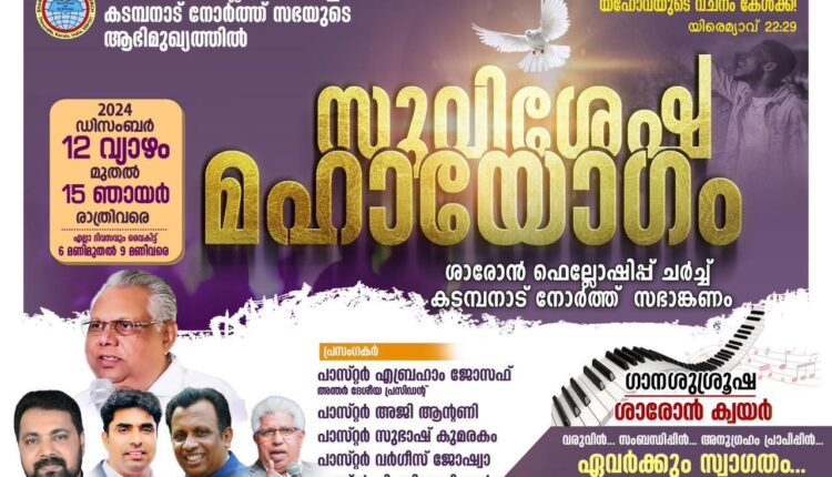 അടൂർ: ശാരോൻ ഫെല്ലോഷിപ്പ് ചർച്ച് കടമ്പനാട് നോർത്ത് സഭയുടെ നേതൃത്വത്തിലുള്ള സുവിശേഷ മഹായോഗം ഡിസംബർ 12 മുതൽ 15 വരെ ദിവസവും വൈകിട്ട് 6-9 വരെ സഭാ അങ്കണത്തിൽ നടക്കും. പാസ്റ്റർമാരായ ഏബ്രഹാം ജോസഫ്, അജി ആന്റണി, സുഭാഷ് കുമരകം, വർഗീസ് ജോഷ്വാ, പി സി ചെറിയാൻ തുടങ്ങിയവർ പ്രസംഗിക്കും. ശാരോൻ ക്വയർ ഗാനങ്ങൾ ആലപിക്കും. പാസ്റ്റർ സാം ഫിലിപ്പ് നേതൃത്വം നൽകും.