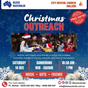 Bless Australia Melbourne Team along with the members of the City Revival Church, Dandenong are holding Christmas Outreach on Saturday, 14th Dec at 10:30 am at Dandenong Hub Square, Dandenong in Melbourne, Australia. Pr. Dinker Alwyn leads the City Revival Church which is located at 74-84 Frawley Road, Hallam. Please contact the numbers on the flyer for more details.