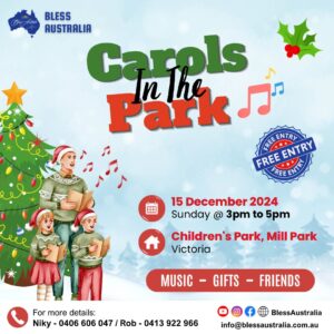 Melbourne, Australia: The Melbourne Team of Bless Australia is conducting Christmas Carols in the local park for the community. This will take place on Sunday, 15th December at 3pm at the Children’s Park in the suburb of Mill Park. Please contact the numbers on the flyer for more details.