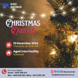 Bless Australia would be singing Christmas carols that carry the spirit of the season, reminding us all of the joy and warmth that comes with togetherness. Many elderly residents may feel a sense of loneliness and we would like to use this opportunity to share with them the love of Jesus and to pray for them.