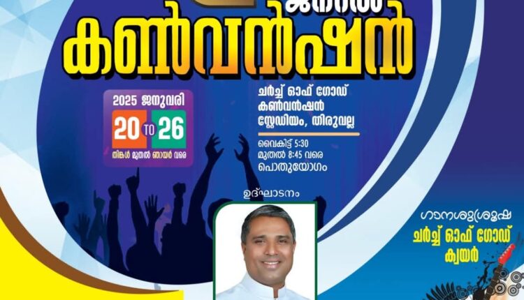 തിരുവല്ല: ചർച്ച് ഓഫ് ഗോഡ് ഇൻ ഇന്ത്യയുടെ 102 – മത് തിരുവല്ലാ ജനറൽ കൺവൻഷൻ 2025 ജനുവരി 20 മുതൽ 26 വരെ തിരുവല്ല, രാമൻചിറ കൺവൻഷൻ സ്റ്റേഡിയത്തിൽ നടക്കും.