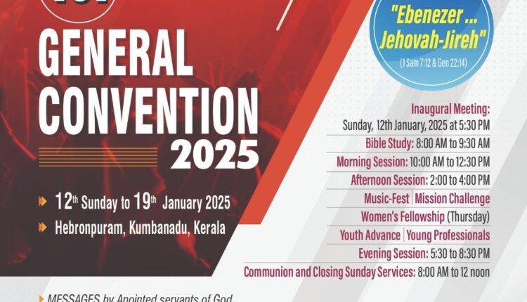 कुम्बनाड: भारतीय पेंटेकोस्टल चर्च (आईपीसी) का 101वां कुम्बनाड जनरल कन्वेंशन 12 से 19 जनवरी, 2025 तक चर्च के मुख्यालय, कुंभनाड, फेब्रोनपुरम में आयोजित किया जाएगा।