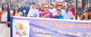 നടന്ന വർണ്ണശബളമായ ജൂബിലി വിളംബര ഘോഷയാത്ര കോളേജ് അങ്കണത്തിൽ സമാപിച്ചു. മാനേജർ ഫാ.ബേബി തോമസ്, അഡ്മിനിസ്ട്രേറ്റർ ഫാ.ഡി.ജോർജുകുട്ടി,പ്രിൻസിപ്പൽ ഡോ.സുമി അലക്സ്,