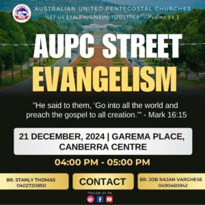 AUPC Team in Canberra conducting street evangelism works on 21 December 2024, from 4:00 PM at Garema Place, Canberra Centre. It is a call to fulfill the Great Commission, offering both a responsibility and an opportunity to bring light to those in need. Rooted in the mission to share the Gospel with the world, the AUPC outreach is spreading across Australia. “Go into all the world and preach the gospel to all creation.” This verse reminds us of the call for all believers to share the message of Christ’s love, hope, and salvation with every corner of the earth.