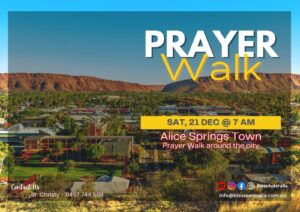 Alice Springs, Australia: On Saturday, 21st December at 7am, Alice Springs Team of Bless Australia will embark on a prayer walk through the heart of this beautiful city to pray for the land of Alice Springs and the community. Please contact the number on the flyer for more details.