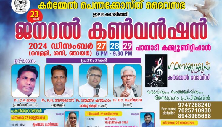 പാമ്പാടി : കർമ്മേൽ പെന്തക്കൊസ്തു ദൈവസഭയുടെ 23- മത് ജനറൽ കൺവെൻഷൻ ഡിസംബർ 27,വെള്ളിയാഴ്ച മുതൽ 29 ഞായർ വരെ പാമ്പാടി കമ്മ്യൂണിറ്റി ഹാളിൽ നടക്കുന്നു. സഭ പ്രസിഡന്റ് പാസ്റ്റർ സി . വി മാത്യു ഉദ്ഘാടനം നിർവഹിക്കുന്നു. പാസ്റ്റർ കെ . എൻ . യേശുദാസ്, മല്ലപ്പള്ളി, പാസ്റ്റർ വർഗീസ് എബ്രഹാം, റാന്നി, പാസ്റ്റർ പി .സി . ചെറിയാൻ, റാന്നി എന്നിവർ ദൈവവചനം പ്രസംഗിക്കുന്നു, സുവി. ഷാജി വലിയപ്ലാക്കൽ ശുശ്രൂക്ഷകൾക്ക് നേതൃത്വം നൽകുന്നു.