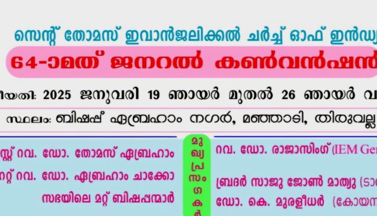 തിരുവല്ല: സെന്റ് തോമസ് ഇവാൻജലിക്കൽ ചർച്ച് ഓഫ് ഇൻഡ്യ 64-ാമത് ജനറൽ കൺവൻഷൻ 19 മുതൽ 26 വരെ തിരുവല്ല മഞ്ഞാടി സഭാ ആസ്ഥാനത്ത് ബിഷപ്പ് ഏബ്രഹാം നഗറിൽ നടക്കും. പ്രിസൈഡിംങ്ങ് ബിഷപ്പ് ഡോ.തോമസ് ഏബ്രഹാം കൺവൻഷൻ ഉദ്ഘാടനം ചെയ്യും. ബിഷപ്പ് ഡോ. ഏബ്രഹാം ചാക്കോ, ബിഷപ്പ് ഡോ. എം.കെ. കോശി, ബിഷപ്പ് ഡോ. ടി.സി ചെറിയാൻ, ബിഷപ്പ് ഡോ. സി.വി മാത്യു, ബിഷപ്പ് എ. ഐ അലക്സാണ്ടർ എന്നിവർ വിവിധ യോഗങ്ങൾക്ക് നേതൃത്വം നൽകും. റവ.ഡോ.രാജാസിംങ്ങ് ബാംഗ്ലൂർ, സാജു ജോൺ മാത്യു, ഡോ. കെ. മുരളീധർ, മനു റസ്സൽ എന്നിവരാണ് മുഖ്യപ്രസംകർ. ബിഷപ്പ് ഏബ്രഹാം നഗറിൽ പൂർത്തിയായി വരുന്ന കൺവെൻഷൻ സെന്ററിന്റെ സമർപ്പണ ശുശ്രൂഷ പ്രാരംഭ ദിനത്തിൽ നടക്കും. സഭയുടെ സംഗീത വിഭാഗമായ ഡിപ്പാർട്ട്മെൻറ് ഓഫ് മ്യൂസിക്കിൻ്റെ നേതൃത്വത്തിലുള്ള ക്വയർ ടീമിൻ്റെ പരിശീലനവും കൺവൻഷന്റെ അനുഗൃഹകരമായ നടത്തിപ്പിനു വേണ്ടിയുള്ള പ്രാർത്ഥനയോഗങ്ങൾക്കും തുടക്കമായി. പ്രിസൈഡിംങ്ങ് ബിഷപ്പ് ഡോ. തോമസ് ഏബ്രഹാമിന്റെ അദ്ധ്യക്ഷതയിൽ ചേർന്ന യോഗത്തിൽ വിവിധ കമ്മറ്റികൾക്ക് രൂപം നൽകി.സഭാ സെക്രട്ടറി റവ.ഏബ്രഹാം ജോർജ് ജനറൽ കൺവീനറായും, വൈദീക ട്രസ്റ്റി റവ. പി.ടി മാത്യു,അത്മായ ട്രസ്റ്റി ജോർജ് വർഗീസ് (ഫിനാൻസ്), റവ.അനിഷ് മാത്യു (പബ്ലിസിറ്റി), പി.എസ് ഏബ്രഹാം, ഡെന്നി എൻ. മത്തായി (പ്രാർത്ഥന), പ്രഫ.വിജി തോമസ് (പരിഭാഷ), റവ. മോൻസി വർഗീസ്, റവ. ജോർജ് ജോസഫ് (ഭക്ഷണം), റവ. അനിഷ് തോമസ് ജോൺ (ഗായകസംഘം), റവ. ഷൈൻ ബേബി സാം (തൽസമയ സംപ്രേക്ഷണം),എ.ജി വർഗീസ് (പന്തൽ), കെ.എം ചെറിയാൻ (സ്തോത്രകാഴ്ച്ച),റവ. തോമസ് മാത്യു (ഗതാഗതം), റവ. അനിൽ ടി. മാത്യു (ഇരിപ്പിട ക്രമീകരണം),സോജു . എസ്. ബാബു (താമസം), റവ. സജി എബ്രഹാം (റിസപ്ഷൻ)എന്നിവർ കൺവീനർമാരായുള്ള സബ് കമ്മിറ്റികളും പ്രവർത്തിക്കുന്നു.