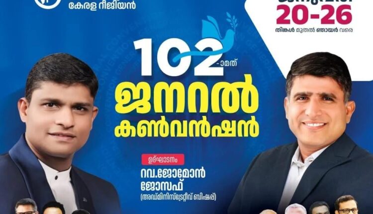 കോട്ടയം: ചർച്ച് ഓഫ് ഗോഡ് ഇൻ ഇന്ത്യ കേരള റീജിയൻ 102-ാമത് ജനറൽ കൺവൻഷൻ 2025 ജനുവരി 20 തിങ്കൾ മുതൽ 26 ഞായർ വരെ കോട്ടയം, നാട്ട പ്രത്യാശ നഗറിൽ (ദൈവസഭ ഗ്രൗണ്ടിൽ) വെച്ച് നടക്കും.