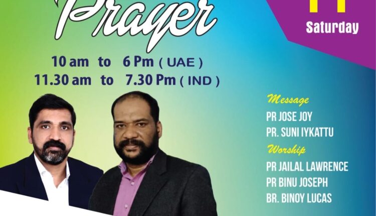 ഷാർജ :പ്രാർത്ഥനാസംഗമം (International Prayer Fellowship ) ഒരുക്കുന്ന ഉപവാസ പ്രാർത്ഥന നാളെ( ജനുവരി 11 ശനിയാഴ്ച )രാവിലെ 10 മണി മുതൽ രാത്രി 6 മണി വരെ (യു. എ. ഇ സമയം ) നടക്കും. പാസ്റ്റർ ജോസ് ജോയ് , പാസ്റ്റർ സുനി ഐക്കാട് എന്നിവർ ദൈവ വചനം ശ്രുശൂഷിക്കുകയും പാസ്റ്റർ ബിനു ജോസഫ് ,പാസ്റ്റർ ജെയ്ലാൽ ലോറൻസ് , ബ്രദർ ബിനോയ് ലൂക്കാസ് എന്നിവർ ആരാധനക്ക് നേതൃത്വം നൽകും. രാജ്യങ്ങൾക്ക് വേണ്ടിയും ( Pray for Nations ) മറ്റുള്ളവരെ വിഷയങ്ങൾക്ക് വേണ്ടിയും ഉള്ള പ്രാർത്ഥനകൾക്ക് പാസ്റ്റർ കെ. പി. ജോസ് വേങ്ങൂർ നേതൃത്വം നൽകും. Zoom മീറ്റിംഗ് ID 332 242 5551 Paascode: 2020