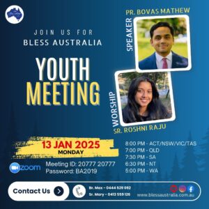 Bless Australia is conducting an online Youth Meeting on Monday, 13th Jan 2025 at 8:00pm Sydney time with Guest Speaker Pr. Bovas Mathew and Worship led by Sr. Roshni Raju. This meeting will be conducted in English and all youths are invited to join.