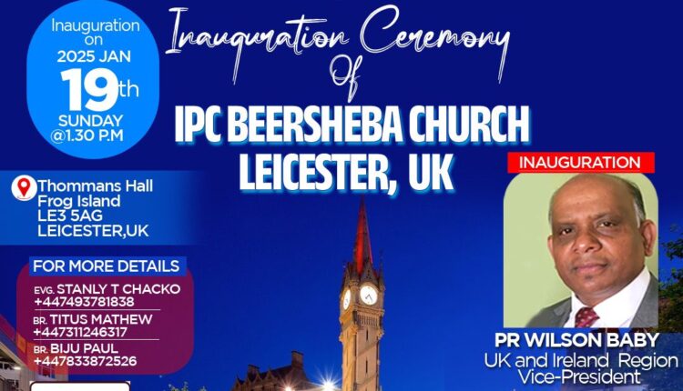 യു.കെ & അയർലൻഡ് റീജീയന്റെ അധികാര പരിധിയിൽ ഐപിസിക്ക് ലസ്റ്ററിൽ പുതിയ കൂടി വരവ് ലസ്റ്ററിൽ 2025 ജനുവരി 19ന് ഉച്ചക്ക് 1:30 പിഎം ന് ദൈവസഭയെ പാസ്റ്റർ. വിൽസൺ ബേബി (വൈസ് പ്രസിഡന്റ് ഓഫ് ഐ .പി സി യു.കെ ആന്റ് അയർലന്റ്) ബേർഷേബാ എന്ന പേരിൽ പ്രാർത്ഥിച്ച് സമർപ്പിക്കുന്നതായിരിക്കും.