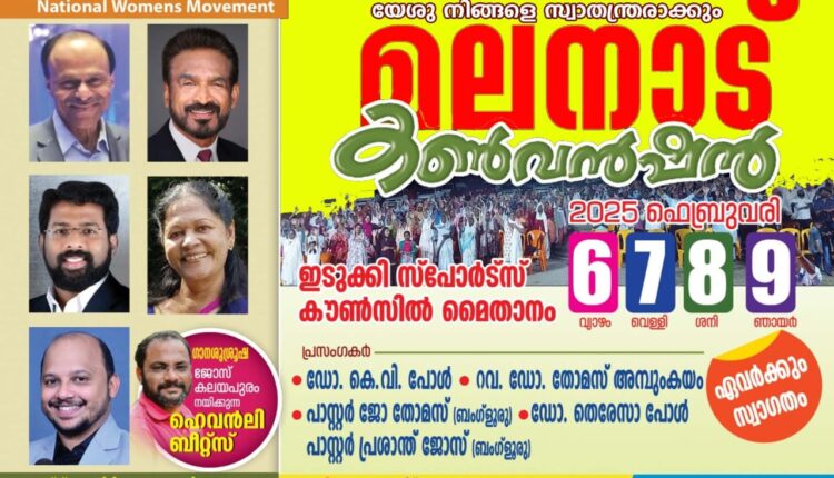 ഇടുക്കി: മലനാട്ടിലെ പെന്തക്കോസ്തു സഭകളുടെ സംയുക്ത സംഗമ വേദിയായ മലനാട് കൺവൻഷൻ മഹാസംഗമത്തിനു ഒരുക്കങ്ങൾ പൂർത്തിയായി. 2025 ഫെബ്രുവരി 6 വ്യാഴം മുതൽ 9 ഞായർ വരെ എല്ലാ ദിവസവും വൈകിട്ട് 6 മുതൽ 9 വരെ ഇടുക്കി സ്പോട്സ് കൗൺസിൽ മൈതാനത്ത് നടക്കുന്ന കൺവൻഷൻ 9 വ്യാഴം വൈകിട്ട് 6 മണിക്ക് മലനാട് കൺവൻഷൻ ചെയർമാൻ പാസ്റ്റർ ഷാജി ഇടുക്കിയുടെ അധ്യക്ഷതയിൽ ചേരുന്ന പൊതുസമ്മേളനത്തിൽ ജനറൽ കൺവീനർ ഡോ . കെ. വി. പോൾ ഉൽഘാടനം ചെയ്യും. ഡോ.തെരേസാ പോൾ , റവ .ഡോ. തോമസ് അമ്പുക്കയം, പാസ്റ്റർ പ്രശാന്ത് ജോസ് ( ബംഗളുരു ), പാസ്റ്റർ ജോ തോമസ്( ബംഗളുരു ) എന്നിവർ വിവിധ യോഗങ്ങളിൽ പ്രസംഗിക്കും. ഫെബ്രുവരി 7 വെള്ളി രാവിലെ 10 മണി മുതൽ പവ്വർ കോൺഫറൻസും, 8 ശനി രാവിലെ 10 മണി മുതൽ പാസ്റ്റേഴ്സ് ആൻഡ് ഫാമിലി കോൺഫറൻസും 9 ഞായർ രാവിലെ 9 മണി മുതൽ സമീപപ്രദേശങ്ങളിലെ ദൈവസഭകളുടെ സംയുക്ത ആരാധനയും തിരുവത്താഴ ശുശ്രൂഷയും നടക്കും. ഇവാ.ജോസ് കലയപുരം നയിക്കുന്ന ഹെവൻലി ബീറ്റ്സ്, കൊട്ടാരക്കര ഗാനശുശ്രൂഷ നിർവഹിക്കും. ഞായറാഴ്ച രാത്രി പൊതുയോഗത്തോടെ 2025 മലനാട് കൺവൻഷൻ സമാപിക്കും . ഇവാ. ജോ ഇടുക്കി , പാസ്റ്റർമാരായ ജോസ് മാമ്മൻ , സന്തോഷ് ഇടക്കര , ഷാജി ജെയിംസ് , സജി .കെ.കെ, സാജു ഫിലിപ്പ് , ഷിനോജ് ടി.വി, ജോസ് കല്ലുകാലാ, മനോജ് ജോസഫ് എന്നിവർ കൺവീനർമാരായ കമ്മറ്റി കൺവൻഷനു നേതൃത്വം നൽകും. മലനാട് പെന്തക്കോസ്തു കൂട്ടായ്മയും , നാഷണൽ പ്രെയർ മൂവ്മെന്റും, നാഷണൽ വിമൻസ് മൂവ്മെന്റും ചേർന്ന് ഒരുക്കുന്ന ഈ മഹാസംഗമം മലയാള പെന്തക്കോസ്ത് ചരിത്രത്താളുകളിൽ ഇടം നേടിയ കൺവെൻഷനാണ്.