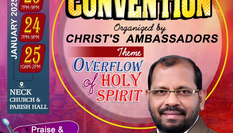കുവൈറ്റ്: അസ്സംബ്ലിസ് ഓഫ് ഗോഡ് കുവൈറ്റ് സഭകളുടെ യുവജന സംഘടനയായ ക്രൈസ്റ്റ് അംബാസ്സഡർസിന്റെ സംയുക്ത യുവജന കൺവെൻഷൻ ജനുവരി 23-25 വരെ നാഷണൽ ഇവാൻജലിക്കൽ ചർച്ച് ഓഫ് കുവൈറ്റിൽ നടക്കും. പ്രസ്തുത യോഗത്തിൽ SIAG സതേൺ ഡിസ്ട്രിക്ട് സൂപ്രണ്ട് Rev. N Peter അവർകൾ വചന ശുശ്രുഷ നിർവഹിക്കും. “പരിശുദ്ധാന്മാവിന്റെ കവിഞ്ഞൊഴുക്ക്” എന്നതാണ് കൺവെൻഷന്റെ ചിന്താവിഷയം.