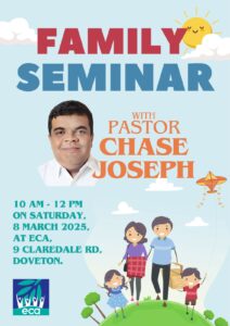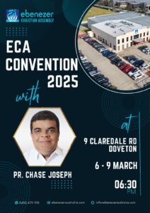 മെൽബൺ: എബനേസർ ക്രിസ്ത്യൻ അസംബ്ലി ചർച്ചിന്റെ ആഭിമുഖ്യത്തിൽ മാർച്ച് 6 മുതൽ 9 തീയതികളിൽ വൈകിട്ട് 6.30 മുതൽ “ECA കൺവെൻഷൻ 2025” നടത്തപ്പെടുന്നു. പാസ്റ്റർ ചെയ്സ് ജോസഫ് ദൈവ വചനത്തിൽ നിന്നും പ്രസംഗിക്കും. കൺവൻഷനോടനുബന്ധിച്ച് 8 ശനിയാഴ്ച രാവിലെ 10 മണി മുതൽ ഫാമിലി സെമിനാറും നടത്തപ്പെടും. സഭാ ശുശ്രൂഷകൻ പാസ്റ്റർ ജോൺ തോമസ് മീറ്റിങ്ങുകൾക്ക് നേതൃത്വം നൽകും.