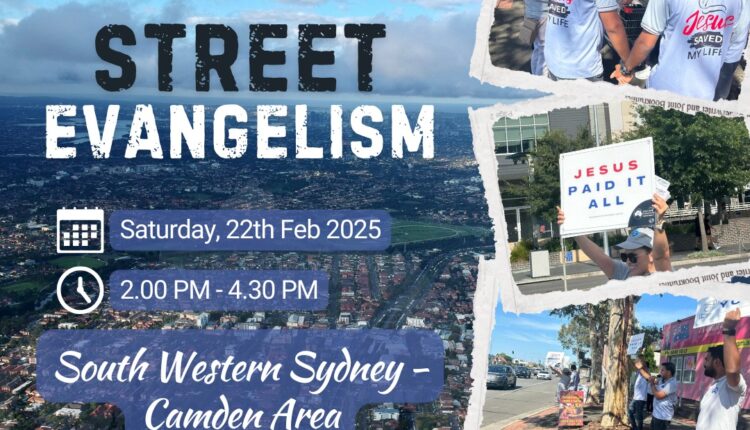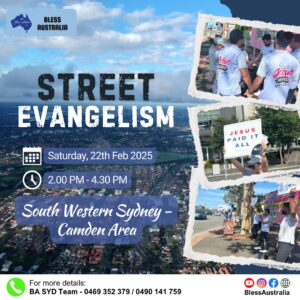 Sydney, Australia: Bless Australia Sydney Team is organising a Street Evangelism event in South Western Sydney – Camden area on Saturday, 22nd February from 2pm to 4:30pm. If you’re passionate about sharing the love of Jesus and would like to be part of this event, please contact us using the numbers provided on the flyer for more details about this event. At the core of Bless Australia is a deep desire to connect with the lost and broken in our society. We believe that every individual deserves the opportunity to experience love, hope, and redemption.