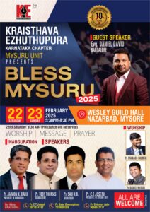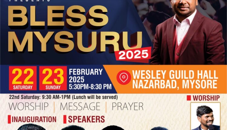 മൈസൂർ: ക്രൈസ്തവ എഴുത്തുപുര കർണ്ണാടക ചാപ്റ്ററും മൈസൂർ യൂണിറ്റും ചേർന്നൊരുക്കുന്ന ദ്വിദിന കൺവൻഷൻ ബ്ലസ് മൈസൂറു 2025 ഇന്നും നാളെയും മൈസൂർ വെസ്ലി ഗ്വിൽഡ് ഹാളിൽ നടക്കും. ക്രൈസ്തവ എഴുത്തുപുര കർണ്ണാടക ചാപ്റ്റർ പ്രസിഡന്റ് പാസ്റ്റർ ജെയ്മോൻ കെ. ബാബു ഉദ്ഘാടനം ചെയ്യും. ഇവാ. ദാനിയേൽ ഡേവിഡ് (ബാംഗ്ലൂർ) മുഖ്യാതിഥിയായിരിക്കും. പാസ്റ്റർമാരായ ടോബി സി. തോമസ് (ബാംഗ്ലൂർ), സജി നിലമ്പൂർ (ബാംഗ്ലൂർ), സി.റ്റി. ജോസഫ് (മൈസൂർ) എന്നിവർ പ്രസംഗിക്കും.