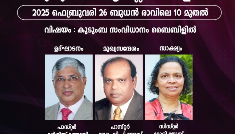 കോട്ടയം: ഇന്ത്യൻ പെന്തക്കോസ്തു ദൈവസഭ വുമൺസ് ഫെലോഷിപ്പ് (സോദരി സമാജം) കോട്ടയം മേഖലാ ‘കുടുംബ സംഗമം’ ഫെബ്രുവരി 26 ബുധനാഴ്ച രാവിലെ 10 മുതൽ എരുമേലി റോട്ടറി ക്ലബ് ഹാളിൽ നടക്കും.