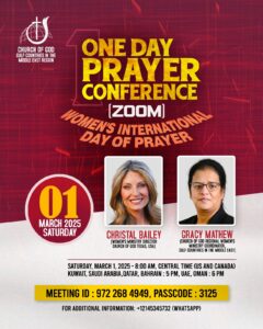 അന്താരാഷ്ട്ര പ്രാർത്ഥനാദിനത്തോടനുബന്ധിച്ച് ചർച്ച് ഓഫ് ഗോഡ് വിമൻസ് മിനസ്ട്രി ഒരുക്കുന്ന ഏകദിന ഓൺലൈൻ പ്രാർത്ഥന സമ്മേളനം 2025 മാർച്ച് 1 ന്.