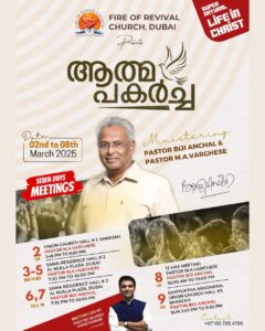 ഫയർ ഓഫ് റിവൈവൽ സഭയുടെ എൽഡേഴ്സ് ബ്ര. ചെറിയാൻ എം. ചെറിയാൻ, ബ്ര. സുരേഷ് കുമാർ, ബ്ര. ജോഷുവ അലക്സാണ്ടർ, ബ്ര. സുജാതൻ നായർ മീറ്റിങ്ങുകളുടെ ഒരുക്കങ്ങൾക്ക് നേതൃത്വം നൽകുന്നു. മീറ്റിങ്ങുകളിൽ സംബന്ധിക്കുവാൻ താത്പര്യം ഉള്ളവർക്ക് യാത്രാ സൗകര്യം ആവശ്യമെങ്കിൽ വിളിക്കേണ്ട നമ്പർ – +971 58 644 9108. എന്ന് സഭയ്ക്ക് വേണ്ടി പബ്ലിസിറ്റി കൺവീനർ ബ്ര. ജെയ്സൺ ദാനി.