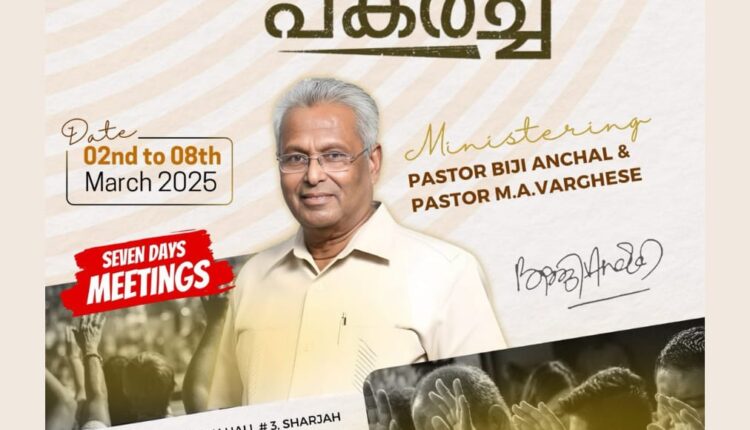 2025 മാർച്ച് 2 ഞായറാഴ്ച ഷാർജ യൂണിയൻ ചർച്ച് ഹാൾ #3ൽ, സഭാ ശുശ്രൂഷകൻ പാസ്റ്റർ സജോഷ് വാകത്താനം അധ്യക്ഷത വഹിക്കുന്ന പ്രാരംഭ യോഗത്തിൽ റവ. എം.എ. വർഗ്ഗീസ്സ് (ബാംഗ്ലൂർ) തിരുവചനം ശുശ്രൂഷിക്കുന്നു.