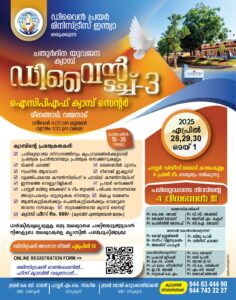 കൽപ്പറ്റ: ഡിവൈൻ പ്രയർ മിനിസ്ട്രീസ് ഇന്ത്യയുടെ ആഭിമുഖ്യത്തിൽ ‘ഡിവൈൻ ടച്ച്’ ചതുർദിന യുവജന ക്യാമ്പ് വയനാട് മീനങ്ങാടി ഐ.സി.പി.എഫ് ക്യാമ്പ് സെന്ററിൽ ഏപ്രിൽ 28 മുതൽ മെയ് 1 വരെ നടക്കും. പാസ്റ്റർ വർഗീസ് ബേബി കായംകുളം & ടീം നേതൃത്വം നൽകും.
