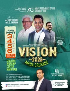 ദുബായ്: അഗാപ്പെ എ.ജി ചർച്ചിന്റെ ആഭിമുഖ്യത്തിൽ നടക്കുന്ന വിഷൻ 2025 മെഗാ ക്രൂസേഡിന്റെ ഒരുക്കങ്ങൾ പൂർത്തിയായി