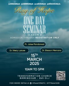 ബർമിംഗ്ഹാം: റേ ഓഫ് ഹോപ്പിന്റെ നേതൃത്വത്തിൽ യുകെയിലെ ബർമിംഗ്ഹാം ട്രാൻസ്ഫോർമേഷൻ ചർച്ച് ഹാളിൽ വെച്ച് മാർച്ച് 15 ന് “വേക്ക് അപ്പ് ആൻഡ് ഡിസേൺ”(Wake up and decern) എന്ന പേരിൽ ഏകദിന സെമിനാർ നടക്കും.നാവിഗേറ്റിംഗ് ഇൻ കൺഫ്യൂസ്ഡ് വേൾഡ് (Navigating in a confused world), ട്രൂത്ത് ആൻഡ് ട്രെൻഡ് (Truth vs Trend), ഡീ കോഡിങ് ദ ബീറ്റ്സ്(Decoding the beats) എന്നീ പേരുകളിൽ നടത്തപ്പെടുന്ന വിവിധ സെഷനുകളിൽ ഡോ. വെസ്ലി ലൂക്കോസ്, പാസ്റ്റർ ജെയ്സ് പാണ്ടനാട്, ബ്രദർ ബ്ലെസ്സൻ മേമന എന്നിവർ ശുശ്രൂഷകർക്ക് നേതൃത്വം നൽകും.