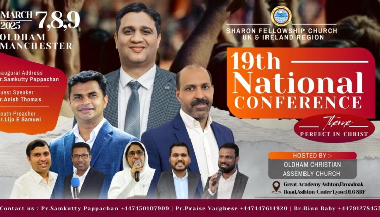 മഞ്ചെസ്റ്റർ :-ഓൾദം ക്രിസ്ത്യൻ അസംബ്ലിയുടെ സഹകരണത്തോടെ 2025 മാർച്ച് 7,8,9 തീയതികളിൽ ശാരോൻ ഫെല്ലോഷിപ് ചർച്ച് യു കെ & ഐർലൻഡ് റീജിയൻ പത്തൊൻപതാമത് നാഷണൽ കോൺഫറൻസ് ഓൾദാമിൽ നടത്തപെടുന്നു.ഗ്രേറ്റ് അക്കാദമി ആഷ്ടൺ (സ്കൂൾ ), അണ്ടർ ലൈൻ,OL6 8RF. ശാരോൻ ഫെലോഷിപ്പ് ചച്ച് യു കെ & ഐർലൻഡ് പ്രസിഡന്റ് പാസ്റ്റർ സാംകുട്ടി പാപച്ചൻ പ്രാർത്ഥിച്ചു ഉദ്ഘാടനം നിർവഹിക്കുന്ന യോഗത്തിൽ Pr. അനീഷ് തോമസ് (കേരള) ദൈവവചനത്തിൽ നിന്നുള്ള ശക്തമായ സന്ദേശങ്ങൾ നൽകും.