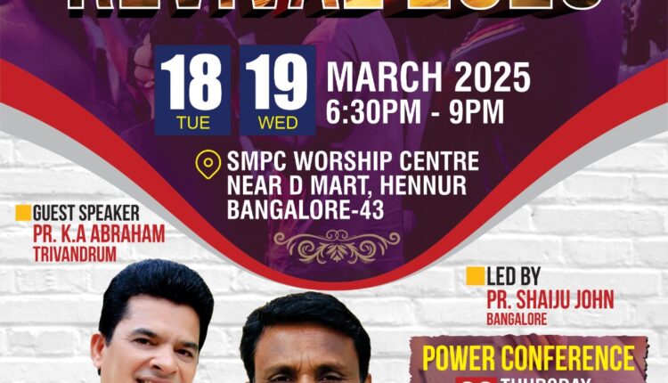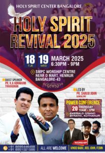 ബാംഗ്ലൂർ: ഹോളിസ്പിരിറ്റ് സെന്റർ ബാംഗ്ലൂർ സഭയുടെ ആഭിമുഖ്യത്തിൽ ഹോളി സ്പിരിറ്റ് റിവൈവൽ 2025 കൺവൻഷൻ, മാർച്ച് 18,19 തീയതികളിൽ, വൈകിട്ട് 6.30 മുതൽ 9 മണി വരെ ഹെണ്ണൂർ ഡി.മാർട്ടിനു സമീപം എസ് എം പി സി വർഷിപ് സെന്ററിൽ നടക്കും.
