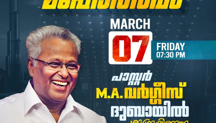 കരാമ: ഇന്ന് വൈകുന്നേരം 7:30 ന് പാസ്റ്റർ ഡോ. എം എ വർഗ്ഗീസ് കരാമയിൽ ശുശ്രൂഷിക്കുന്നു. പെനിയെൽ ഇന്റർനാഷണൽ കമ്യൂണിറ്റി നടത്തുന്ന വിടുതലിൻ മഹോത്സവം എന്ന മീറ്റിങ്ങിൽ ആണ് അദ്ദേഹം ശുശ്രുഷിക്കുന്നത്. ബെഥേൽ എജി ബാംഗ്ലൂർ സഭയുടെ സീനിയർ ശുശ്രൂഷകനായ പാസ്റ്റർ ഡോ. എം എ വർഗ്ഗീസ് ലോക പ്രശസ്ത സുവിശേഷ പ്രാസംഗികൻ ആണ്.