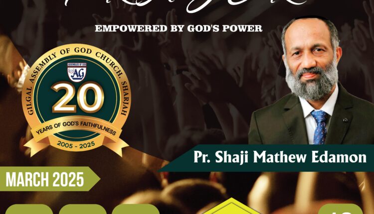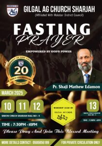 ഷാർജ. ഗിൽഗാൽ എ. ജി ചർച്ചിന്റെ ആഭിമുഖ്യത്തിൽ ഉപവാസ പ്രാർത്ഥന 2025 മാർച്ച് 10 മുതൽ 14 വരെ യുള്ള ദിവസങ്ങളിൽ നടക്കും . എല്ലാ ദിവസവും വൈകിട്ട് 7:30 മുതൽ 10 മണി വരെ ഷാർജ യൂണിയൻ ചർച്ചിൽ വച്ച് ക്രമീകരിച്ചിരിക്കുന്ന മീറ്റിംഗുകളിൽ പാസ്റ്റർ ഷാജി മാത്യു , ഇടമൺ ദൈവവചനത്തിൽ നിന്നും ശുശ്രുഷിക്കുന്നതായിരിക്കും .