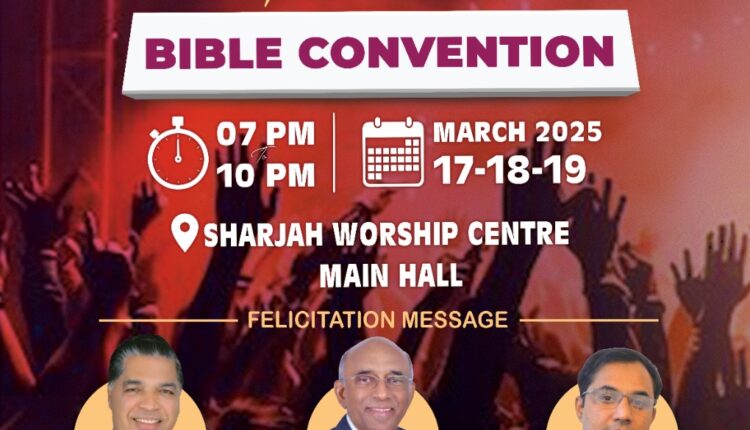 ഷാർജ : ഫിലദെൽഫിയ ഏ ജി ചർച്ചിന്റെ അഭിമുഖ്യത്തിൽ മാർച്ച്17,18,19 (തിങ്കൾ, ചൊവ്വ,ബുധൻ) തീയതികളിൽ ഷാർജ വർഷിപ്പ് സെന്റർ മെയിൻ ഹാളിൽ വച്ചു സുവിശേഷമഹാ യോഗവും കാത്തിരിപ്പു യോഗവും നടത്തപ്പെടുന്നു.