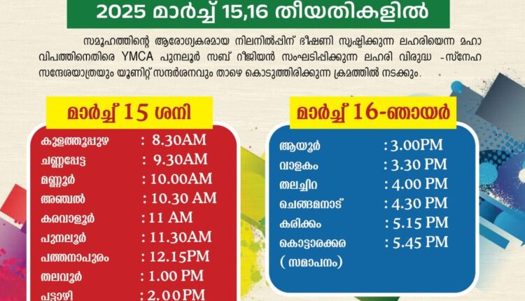 കുളത്തുപ്പുഴ : വൈഎംസിഎ പുനലൂർ സബ് റീജിയൻ ലഹരി വിരുദ്ധ ബോധവൽക്കരണത്തിൻ്റെ ഭാഗമായി യൂണിറ്റ് വൈഎംസിഎകളിൽ രൂപീകരിക്കുന്ന ജനകീയ കവചം – ജാഗ്രത സമിതി രൂപീകരണം ലക്ഷ്യമാക്കി ദ്വിദിന ലഹരി വിരുദ്ധ -സ്നേഹ സന്ദേശയാത്രയും യൂണിറ്റ് സന്ദർശനവും -ജനബോധൻ നാളെയും മറ്റന്നാളുമായി നടക്കും.