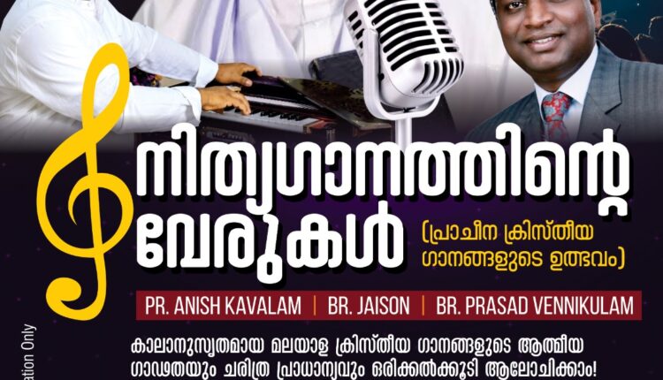 “നിത്യഗാനത്തിന്റെ വേരുകൾ” എന്ന തലക്കെട്ടിൽ പുരാതന മലയാള ക്രിസ്തീയ ഗാനങ്ങളുടെ ആത്മീയ വിശേഷതയും അതിന്റെ ചരിത്രപ്രാധാന്യവും പങ്കുവെയ്ക്കുന്നതിന് അവസരമൊരുക്കുന്ന ഈ സംഗമത്തിൽ മ്യൂസിഷ്യൻ ജയ്സൺ പത്തനംതിട്ട ഗായകൻ പ്രസാദ് വെണ്ണിക്കുളം എന്നിവരും പങ്കെടുക്കും.