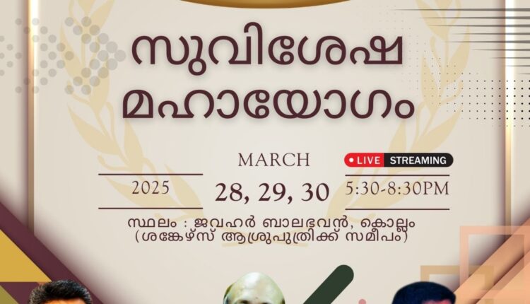 കൊല്ലം: അസംബ്ലീസ് ഓഫ് ഗോഡ് കൊല്ലം സഭയുടെ വജ്ര ജൂബിലിയോട് അനുബന്ധിച്ച് മാർച്ച് 28 മുതൽ 30 വരെ കൊല്ലം ജവഹർ ബാലഭവനിൽ സുവിശേഷ മഹാ യോഗവും സംഗീത വിരുന്നും നടക്കും. ദിവസവും വൈകിട്ട് 5.30 മുതൽ 8.30 വരെ നടക്കുന്ന കൺവെൻഷനിൽ പാസ്റ്റർ റെജി ശാസ്താംകോട്ട, ഡോക്ടർ മുരളിധർ, പാസ്റ്റർ ഷാജി യോഹന്നാൻ എന്നിവർ പ്രസംഗിക്കും.കൊട്ടാരക്കര ഹെവൻലി ബീറ്റ്സ് സംഗീത ശുശ്രൂഷ നയിക്കും. സഭാ ശുശ്രൂഷകൻ പാസ്റ്റർ സജി ജെ. സെക്രട്ടറി ഡോ. ഫിലിപ്പ് സാമുവൽ തുടങ്ങിയവർ നേതൃത്വം കൊടുക്കും.