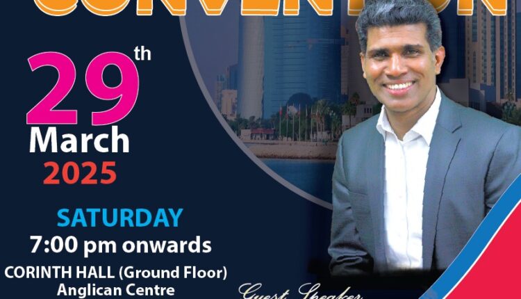 ഖത്തർ : ശാരോൻ ഫെലോഷിപ്പ് ചർച്ചിന്റെ ആഭിമുഖ്യത്തിൽ ക്രമീകരിച്ചിരിക്കുന്ന ഏകദിന കൺവൻഷൻ മാർച്ച് 29 ശനിയാഴ്ച വൈകിട്ട് 7മണി മുതൽ ആംഗ്ലിക്കൻ സെന്ററിൽ കോരിന്തു ഹാളിൽ വെച്ച് നടത്തപ്പെടും.