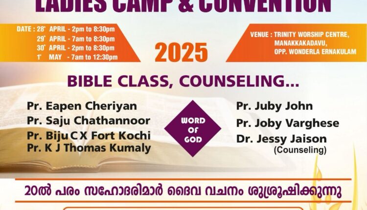 എറണാകുളം : വേൾഡ് പെന്തെക്കോസ്തു കൗൺസിൽ & വിമൺസ് മിനിസ്ട്രീയുടേയും സംയുക്താഭിമുഖൃത്തിൽ വിഷൻ ബിയോണ്ട് 2030 എന്ന ലക്ഷ്യത്തിൽ ലേഡീസ് ക്യാമ്പും,കൺവൻഷനും ഏപ്രിൽ 28 മുതൽ മേയ് 1 വരെ എറണാകുളം വണ്ടർല അമുസ്മെൻ്റ് പാർക്കിനു എതിർവശം മനക്കക്കടവ് ട്രിനിറ്റി വർഷിപ്പ് സെൻ്ററിൽ വച്ച് നടക്കും ബൈബിൾ ക്ലാസ്, കൗൺസിലിംഗ്, വചന ശുശ്രൂഷ, ആത്മനിറവിൽ ഉള്ള ആരാധന, എന്നിവ നടക്കും. പാസ്റ്ററന്മാരായ ഈപ്പൻ ചെറിയാൻ,സജു ചാത്തന്നൂർ, ബിജു cx ഫോർട്ട് കൊച്ചി, കെ.ജെ തോമസ് കുമളി എന്നിവർ ബൈബിൾ ക്ലാസ്സെടുക്കും. ഡോ. ജെസ്സി ജയ്സൺ പാസ്റ്റർ ജൂബി ജോൺ, പാസ്റ്റർ ജോബി വർഗ്ഗീസ് എന്നിവരാണ് കൗസിലർന്മാർ. കൂടാതെ 20-ൽപരം സഹോദരിന്മാർ ദൈവവചനം പ്രസംഗിക്കും ഹോളി ബീറ്റ്സ് എരണാകുളം ഗാനശുശ്രൂഷ നിർവഹിക്കും.ടീം ഭാരവാഹികൾ നേതൃത്വം നൽകും.