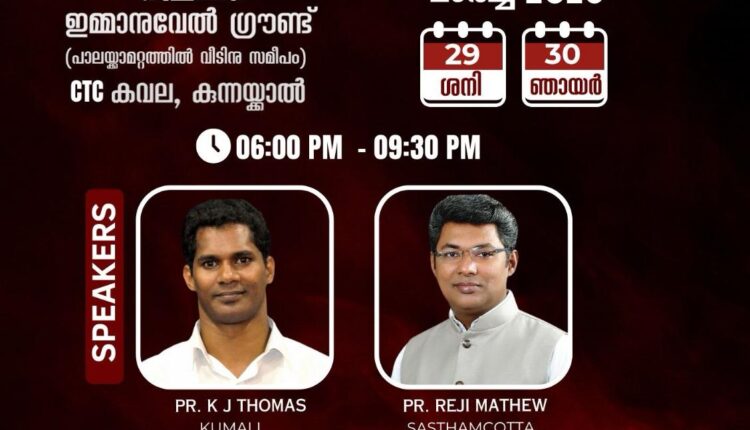 മൂവാറ്റുപുഴ : കുന്നയ്ക്കാൽ (വാളകം) സി റ്റി സി കവലയ്ക്കടുത്ത് പാലയ്ക്കാമറ്റത്തിൽ വീടിന് സമീപത്ത് ഇമ്മാനുവേൽ ഗ്രൗണ്ടിൽ വെച്ച് ആക്റ്റ് ഓഫ് ഫെയ്ത് മിനിസ്ട്രീസിൻ്റെയും യെസൂസ് ഫൗണ്ടേഷൻ്റെയും ആഭിമുഖ്യത്തിൽ മാർച്ച് 29 ശനി,30 ഞായർ ദിവസങ്ങളിൽ സുവിശേഷയോഗവും സംഗീത വിരുന്നും നടക്കും.വൈകിട്ട് 06:00 മണി മുതൽ 09:30 മണി വരെ നടത്തപ്പെടുന്ന യോഗങ്ങളിൽ കർത്താവിൽ പ്രസിദ്ധരായ പ്രഭാഷകർ പാസ്റ്റർ കെ.ജെ. തോമസ് (കുമളി),പാസ്റ്റർ റെജി മാത്യു(ശാസ്താംകോട്ട) എന്നിവർ പ്രസംഗിക്കും. ബ്രദർ റിച്ചു വർഗീസ് പാലനാട്ടിൽ സംഗീത ശുശ്രൂഷ നിർവഹിക്കും. യോഗങ്ങളോടനുബന്ധിച്ച് 30-ാം തീയതി ഞായറാഴ്ച ഉച്ചകഴിഞ്ഞ് 04:00 മണി മുതൽ 05:30 വരെ പ്രത്യേക യൂത്ത് മീറ്റിംഗും നടത്തപ്പെടും. പാസ്റ്റർ സി ഏലിയാസ്, പാസ്റ്റർ കുര്യാക്കോസ് തോമസ്, ബ്രദർ തോംസൺ കുര്യാക്കോസ്,ബ്രദർ ജെസ്റ്റിൻ ജെയ്ൻ എന്നിവർ നേതൃത്വം നൽകും.