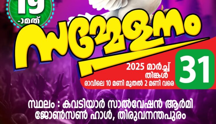 തിരുവനന്തപുരം: അഖിലേന്ത്യാ ഇടയ സംഗമത്തിൻ്റെ 19-ാമത് സമ്മേളനം മാർച്ച് 31 തിങ്കൾ രാവിലെ 10 മുതൽ ഉച്ചയ്ക്ക് 2 വരെ തിരുവനന്തപുരം, കവടിയാർ സാൽവേഷൻ ആർമി ജോൺസൺ ഹാളിൽ വെച്ച് നടക്കും.