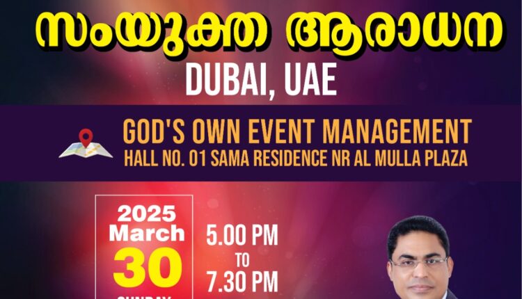 ഷാർജ :പ്രാർത്ഥനാസംഗമം (International Prayer Fellowship ) ന്റെ യുഎ ഇ യിലെ അബുദാബി, ദുബായ്, ഷാർജ, റാസൽ ഖൈമ സഭകളുടെ സംയുക്ത ആരാധന ഞായറാഴ്ച വൈകിട്ട് 5 മുതൽ 7:30 വരെ ഗോഡ്സ് ഔൺ ഇവന്റ് മാനേജ്മെന്റ്, ഹാൾ നമ്പർ 1, സാമാ റെസിഡൻസ്, നിയർ അൽമുള്ള പ്ലാസ, ദുബൈയിൽ നടക്കുന്നു.പാസ്റ്റർ കെ. പി. ജോസ് വേങ്ങൂർ, പാസ്റ്റർ ജിജി തോമസ്,പാസ്റ്റർ ലിജോ സിറിയക് എന്നിവർ ആരാധനക്ക് നേതൃത്വം നൽകും. ഐ പി എഫ് കൊയർ വർഷിപ് നടത്തും .