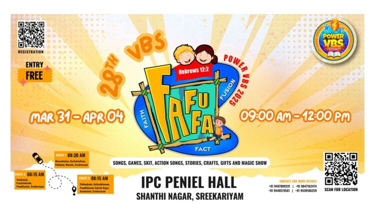 ശ്രീകാര്യം : ഇന്ത്യ പെന്തക്കോസ്ത് ദൈവസഭയുടെ ആഭിമുഖ്യത്തിൽ പവർ വിബിഎസുമായി സഹകരിച്ച് ഫാ ഫൂ ഫാ എന്ന തീം ആസ്പദമാക്കി 28-ാമത്തെ വി ബി എസ് മാർച്ച് മാസം 31 മുതൽ ഏപ്രിൽ മാസം നാലാം തീയതി വരെ 9 മണി മുതൽ 12 മണി വരെ ദൈവസഭയിൽ നടക്കുന്നതാണ്.